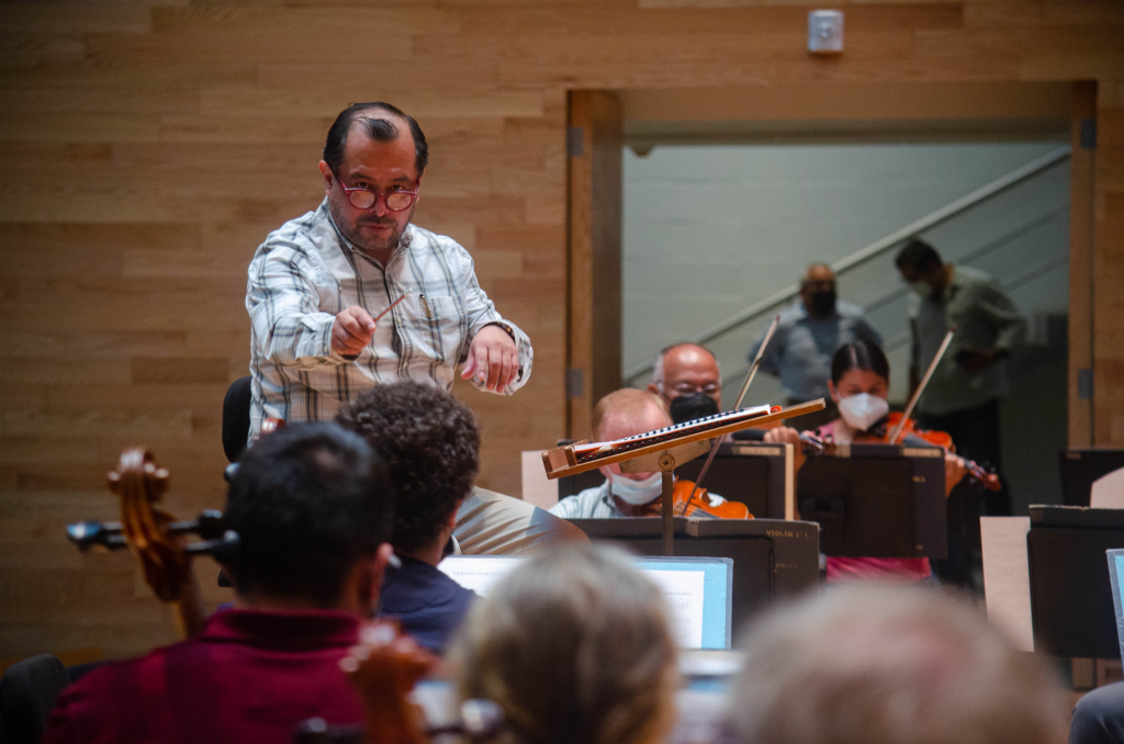 Pie de foto: Ensayo general de la OSX con Rubén Flores y el solista Lázaro Jascha González.