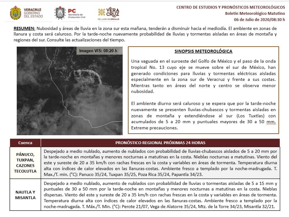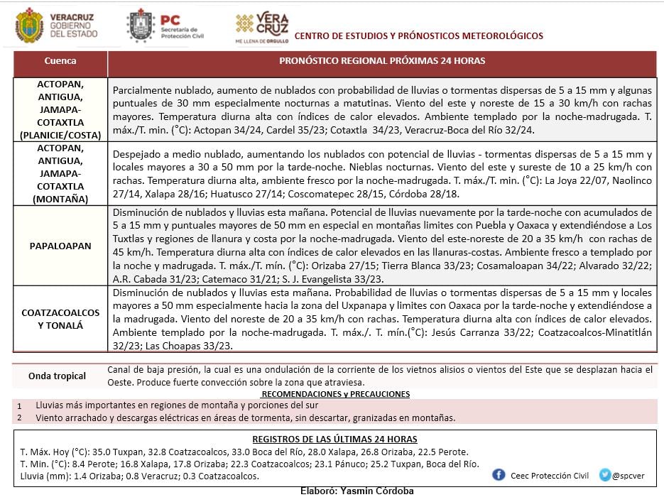 *Región Sur*: (Cuencas del Papaloapan, Coatzacoalcos y Tonalá, incluyendo Los Tuxtlas): Disminución de los nublados y la probabilidad de tormentas (actividad eléctrica y ráfagas de viento) y lluvias conforme avance la mañana, aumentando nuevamente por la tarde-noche y madrugada. Acumulados estimados de 5 a 15 mm con máximos de 20 a 40 mm (sin descartar mayores), estas últimas especialmente en regiones montañosas. Nieblas nocturnas a matutinas. Viento dominante del Noreste de 20 a 35 km/h con rachas mayores en zonas de tormenta. Ambiente caluroso al mediodía-tarde. Tmáx./Tmín. 33-37/22-25°C (Menores en la región de los Tuxtlas).