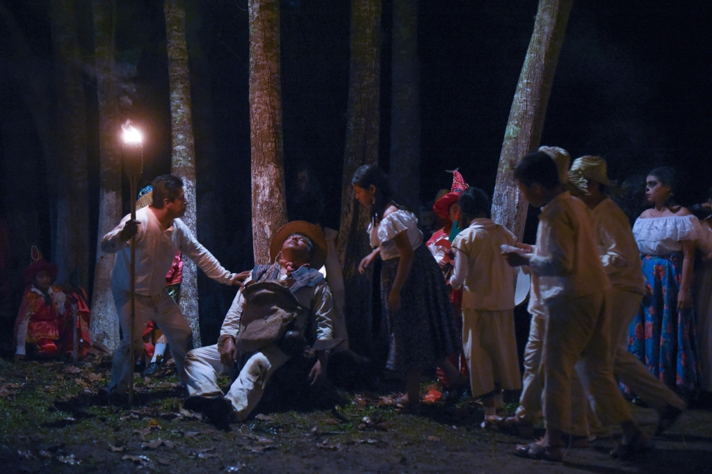 La noche ha caído sobre el bosque, y en Los Pozos, el lugar donde se desarrolla la obra, se alzan las catrinas… los vestidos revolotean, la banda toca La llorona. Las 150 sillas están ocupadas, y más de 200 personas contemplan de pie, entre el humo de incienso, un hecho sin precedente en el pueblo: el nacimiento del Grupo de Teatro Campesino Comunitario de Tronconal.