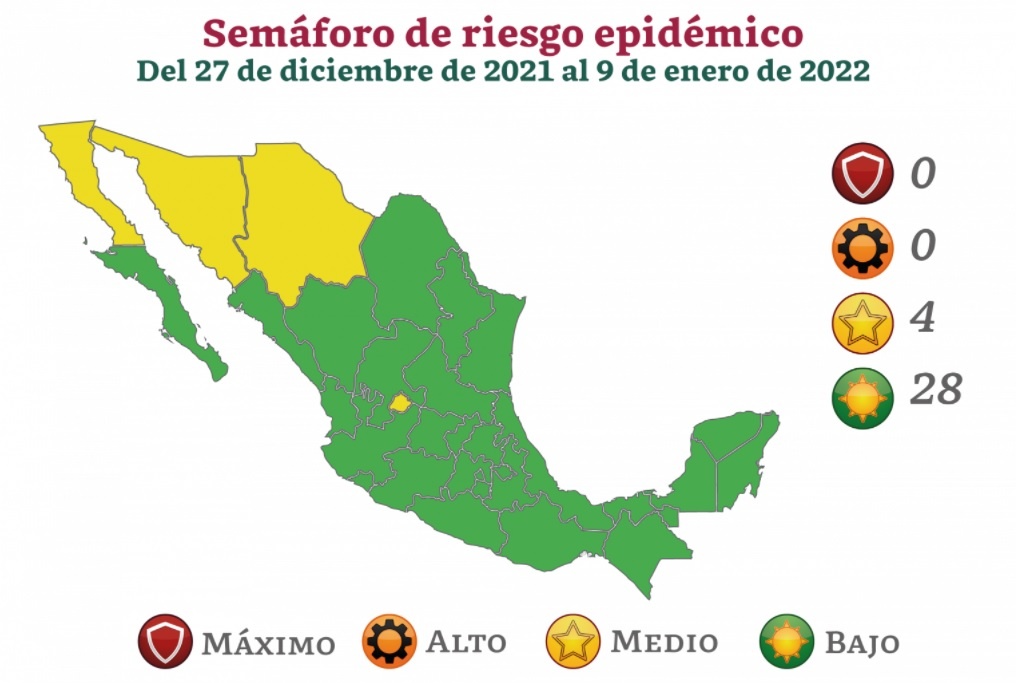 Se concluirá el año 2021 con 28 estados en semáforo verde por COVID-19, mientras que cuatro estarán en semáforo amarillo del 27 de diciembre de 2021 al 9 de enero de 2022.