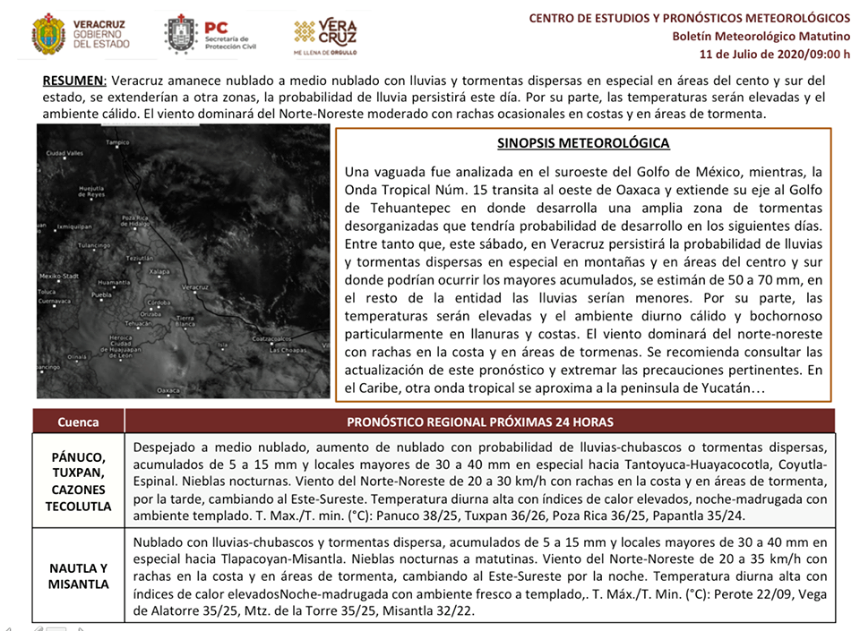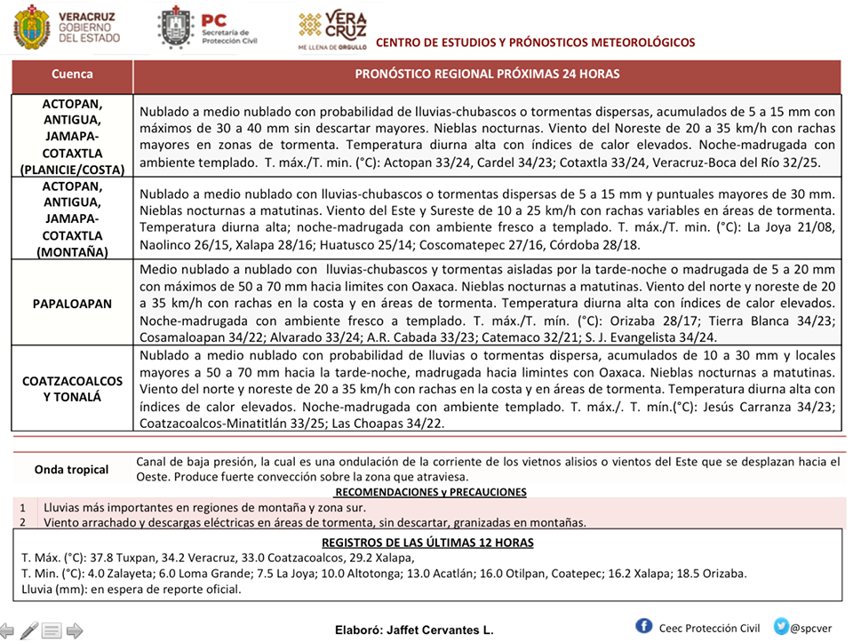 *Resumen*: En las próximas 24 horas persistirá el ambiente caluroso al mediodía-tarde especialmente en zonas bajas y con los máximos valores de temperatura en la región norte. Asimismo se prevé condiciones para tormentas-lluvias aisladas y de intensidad ocasionalmente moderada a fuerte se concentre en el centro y sur de la entidad. El viento dominante en la costa será del Sureste, Este y Noreste de 20 a 30 km/h con rachas de 45 km/h esta últimas en la norte, rachas mayores pueden registrarse en zonas de tormenta. Es importante seguir las indicaciones de las autoridades municipales de protección civil.