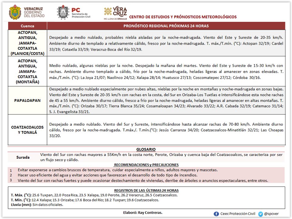 *Resumen*: Este martes se espera ambiente caluroso y seco en la mayor parte del estado de Veracruz, previéndose que el evento de Surada en algunos sectores de la entidad se intensifique. Se recomienda extremar las precauciones pertinentes. Consulte la *Alerta Gris*.