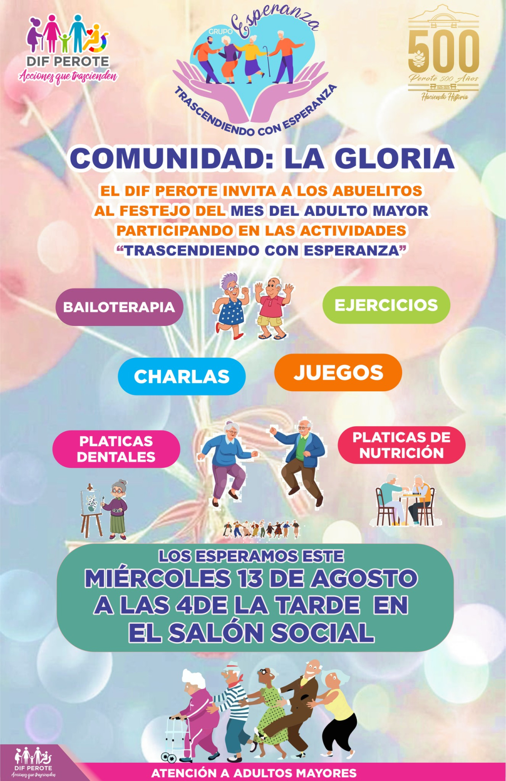 En el marco del Mes del Adulto Mayor, el DIF Perote y el Grupo Esperanza llegamos a la comunidad de La Gloria a las 4 de la tarde en el Salón Social, para cerrar este día de recorrido, compartiendo momentos de alegría, cariño y unión.