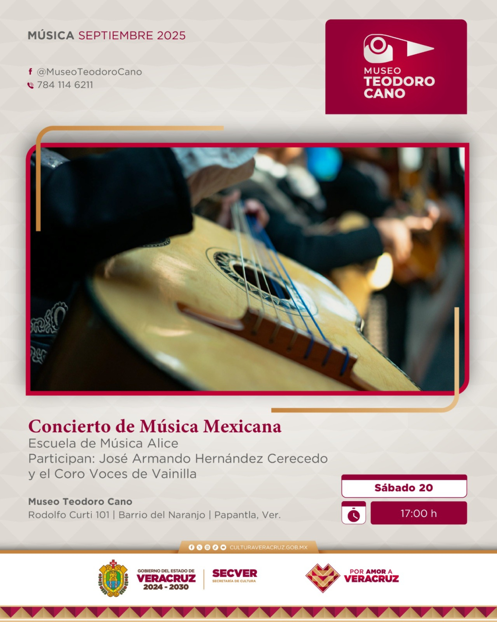 La Secretaría de Cultura de Veracruz (SECVER) invita al Concierto de Música Mexicana que se realizará el sábado 20 a las 17:00 horas en el Auditorio del Museo Teodoro Cano, en Papantla. La entrada es gratuita.