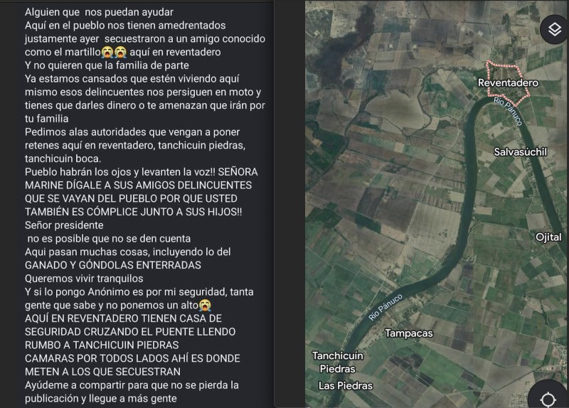 Vecinos y fuentes anónimas denuncian el presunto secuestro de un familiar y señalan la ubicación donde estaría retenido, en una casa de seguridad localizada “saliendo de Reventadero, al cruzar el puente con rumbo a Tanchicuin”. Según las versiones recabadas, el grupo al que atribuyen los hechos se identifica como “Mafia Veracruzana”.