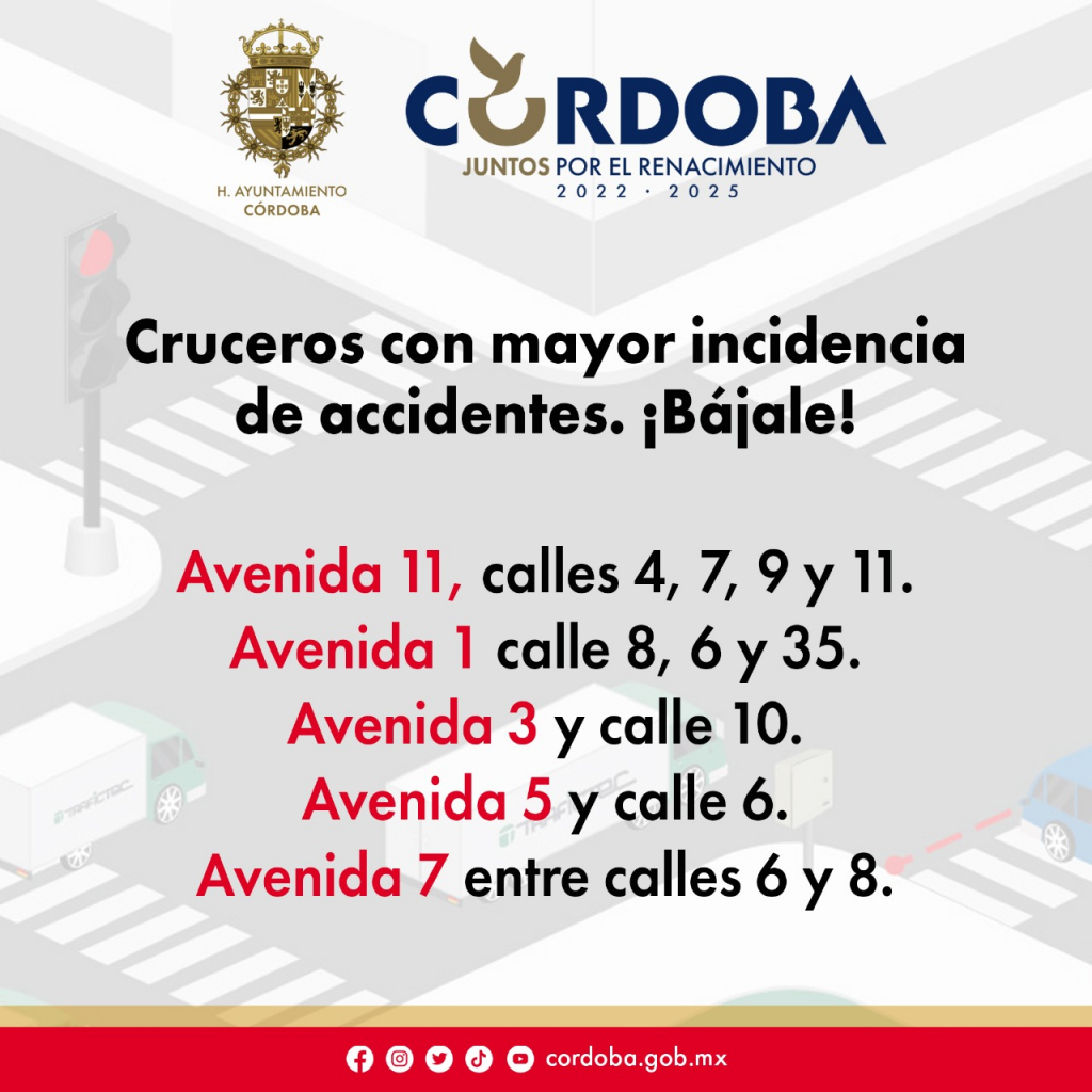 Córdoba, Ver., (11 de abril de 2022). - Durante el primer trimestre del año, en Córdoba se han registrado 275 accidentes viales, de los cuales han resultado 123 lesionados y dos personas fallecidas. De acuerdo con los reportes de la coordinación de Tránsito y Vialidad hay 11 cruceros con mayor incidencia, por lo que piden reducir la velocidad y mantener la distancia.