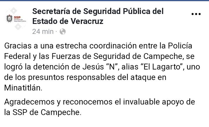 En un mensaje a través de redes sociales, la Secretaria de Seguridad Pública dio a conocer la aprehensión del segundo autor de la masacre de 13 personas en una fiesta familiar en Minatitlán.
