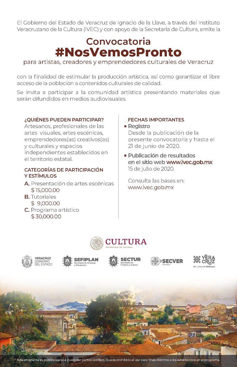 El Gobierno del Estado, a través del Instituto Veracruzano de la Cultura (IVEC) y la Secretaría de Cultura (CULTURA), invita a participar en la convocatoria #NosVemosPronto; a fin de estimular la producción artística y garantizar el libre acceso a contenidos de calidad.