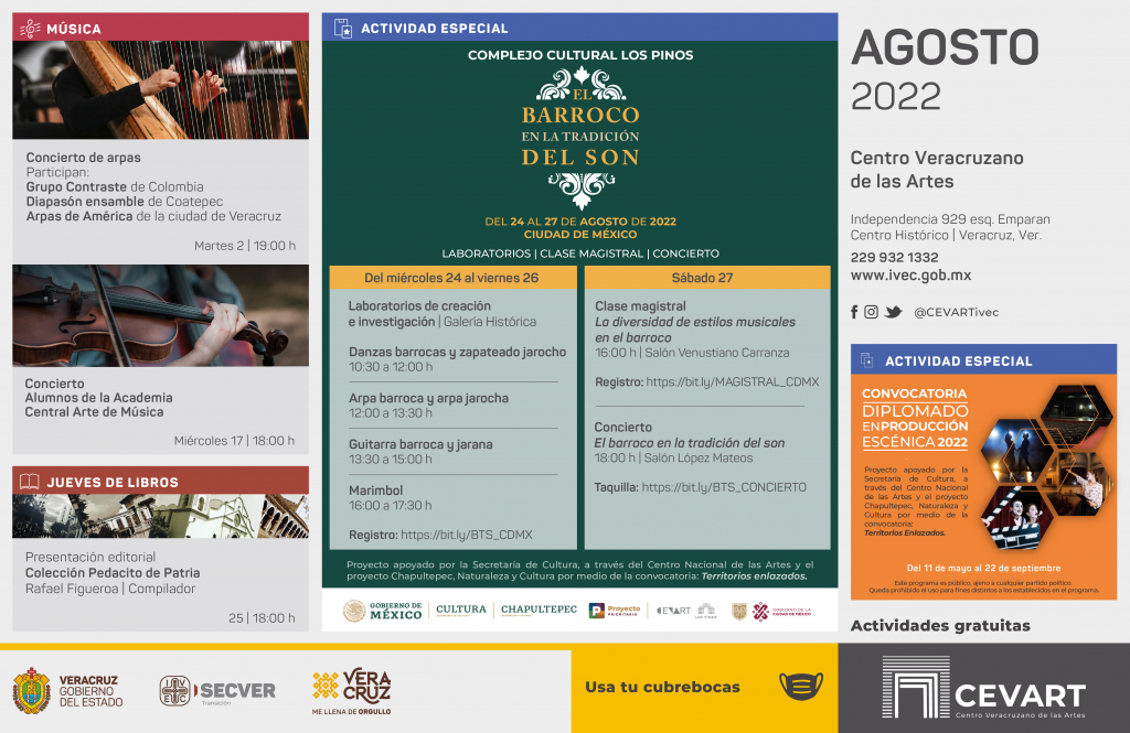 El Instituto Veracruzano de la Cultura invita a conocer la cartelera de actividades del Centro Veracruzano de las Artes Hugo Argüelles (CEVART), que en agosto se realizarán en el puerto de Veracruz y en el Complejo Cultural Los Pinos, en la Ciudad de México.