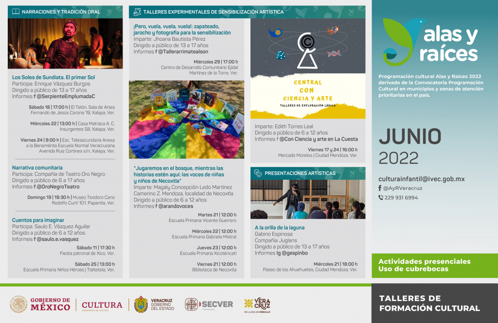 El Instituto Veracruzano de la Cultura (IVEC), en coordinación con la Secretaría de Cultura federal y a través del Programa de Desarrollo Cultural Infantil y Juvenil Alas y Raíces, presentará los proyectos beneficiados en la convocatoria 2022 de la iniciativa que busca garantizar el acceso, participación y contribución de infancias y adolescencias en la vida cultural de sus comunidades.