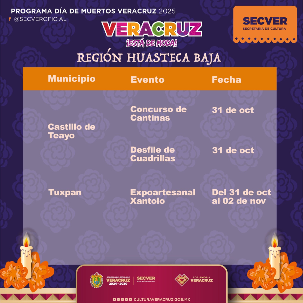 La Secretaría de Cultura de Veracruz (SECVER) invita a participar en las actividades conmemorativas con motivo de la celebración de Día de Muertos, que se realizarán en las Huastecas Alta y Baja.