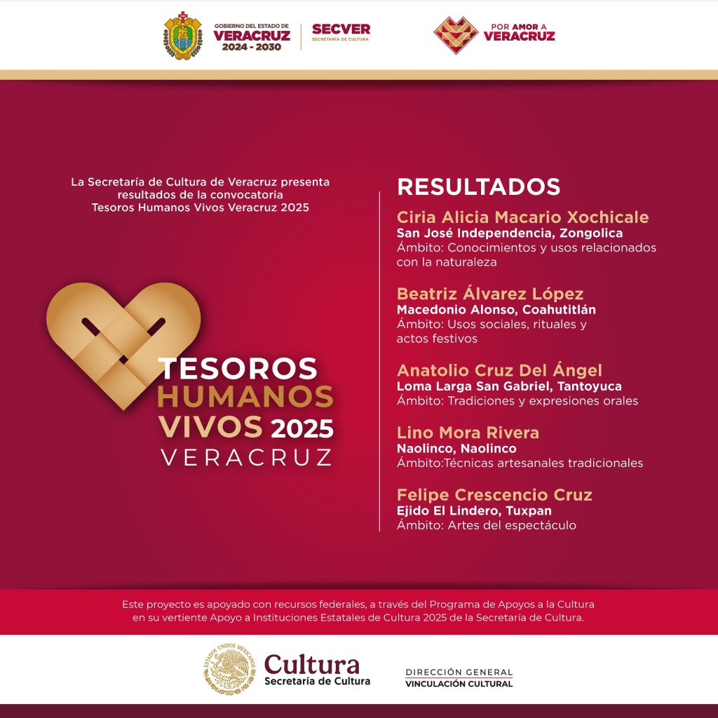 Consulta los resultados de la convocatoria Tesoros Humanos Vivos de Veracruz 2025 en las redes sociales de la dirección de @DesarrolloCulturalRegionalSECVER y la @SECVERoficial.