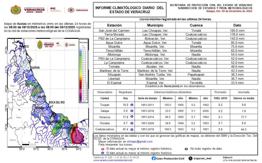 Durante las últimas 24 horas se registraron lluvias significativas en el sur del estado, principalmente en las cuenca de Tonalá y la cuenca baja del río Coatzacoalcos, donde estaciones como San José del Carmen y Tierra Morada reportaron acumulados excepcionales de 195 mm y 178 mm, respectivamente. También se observaron valores entre 50 y 140 mm en localidades de Misantla, Moloacán, Coatzacoalcos y San Andrés Tuxtla, mientras que el resto del estado mostró lluvias moderadas o aisladas, con predominio de valores menores a 10 mm.