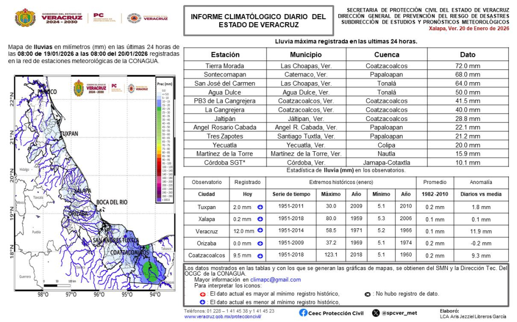 Durante las últimas 24 horas, con corte a las 08:00 h, se registraron lluvias significativas en el sur del estado de Veracruz, principalmente en las cuencas de los ríos Coatzacoalcos, Tonalá y Papaloapan. Los acumulados más relevantes se concentraron en la región de Las Choapas y Coatzacoalcos, con valores que superaron los 70 mm en Tierra Morada y Sotecomapan, así como registros importantes en San José del Carmen y Agua Dulce. En el centro y norte del estado, las precipitaciones fueron ligeras y aisladas, con acumulados menores.