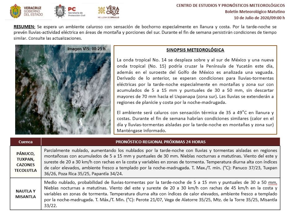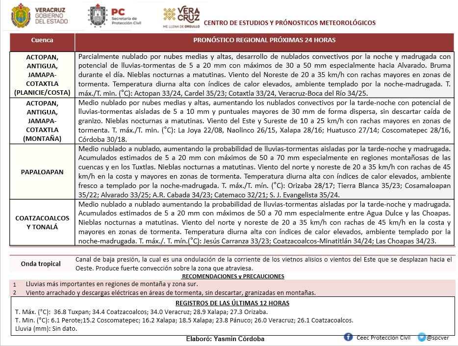 *Resumen*: En las próximas 24 horas a partir de esta tarde-noche) se prevé aumenten las condiciones para tormentas (actividad eléctrica, ráfagas de viento y caída de granizo) y lluvias principalmente del centro al sur del estado, siendo probable se presenten de intensidad fuerte entre las cuencas del Papaloapan al Tonalá. El ambiente persistirá caluroso al mediodía-tarde. El viento dominante será del Norte, Noreste y Este de 20 a 30 km/h con rachas de 45 km/h en la costa y mayores en zonas de tormenta. Es importante seguir las indicaciones de las autoridades municipales de protección civil.
