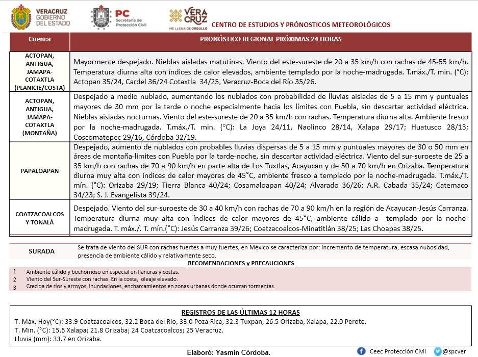 *Resumen*: En las próximas 24 horas dominará ambiente muy caluroso y seco en gran parte del estado de Veracruz, siendo probables chubascos-tormentas especialmente en los límites con Puebla e Hidalgo por la tarde-noche. El evento Surada puede alcanzar su mayor intensidad entre este día y mañana martes, disminuyendo la mañana del miércoles. Se recomienda continuar con las precauciones, evitar acciones que puedan originar incendios forestales, de pastizales y de basureros, así como acatar las indicaciones de las autoridades locales de protección civil. Es importante actualizarse diariamente de las condiciones meteorológicas a través de los informes meteorológicos. Consulte *Aviso Especial* por Surada y ambiente caluroso a muy caluroso.