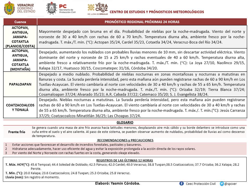 Amanece con cielo despejado a medio nublado con algunas áreas de nieblas y neblinas. Esta madrugada la Surada registro rachas máximas de 122 km/h en la parte alta de los Tuxtlas, del orden de 90 km/h en Orizaba y 70 km/h en Acayucan.