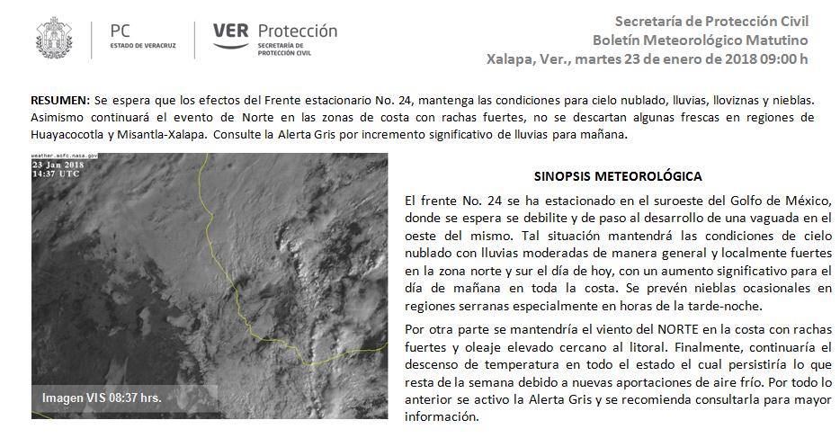 Resumen: En las próximas 24 horas se espera descenso de temperatura y que continúe el ambiente fresco a frío por la noche-madrugada con heladas en zonas serranas. Adicionalmente, se prevé aumente notablemente el potencial de lluvias, lloviznas y nieblas con máximos acumulados en 24 horas de 50 a 70 mm (Se debe prestar mayor atención en las cuencas del Tecolutla, Nautla, Misantla, Colipa; región de Los Tuxtlas y cuencas del Coatzacoalcos y Tonalá. El viento en la costa continuará del NORTE con mayor intensidad (rachas de 60 a 75 km/h). Mañana miércoles 24 se prevé siga el descenso de la temperatura en todo la entidad, mayor potencial de lluvias y NORTE más intenso. Por todo lo anterior se ha emitido la Alerta Gris, consúltela.