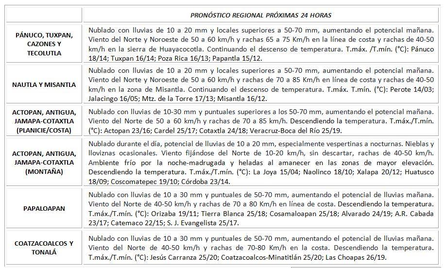 Mayormente nublado con lluvias localmente fuertes y probables tormentas. Acumulados esperados en 24 horas de 5 a 30 mm y máximos de 50 a 70 mm y mayores mañana. Nieblas en la región de los Tuxtlas. Viento del NORTE en la costa con rachas de 60 a 75 km/h. Descenso de temperaturas. TMáx/TMín 25-27/17-19°C (Menores en la región de los Tuxtlas).