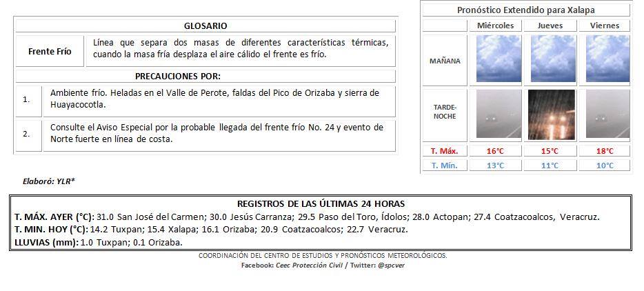 Mayormente nublado con nieblas, lluvias y lloviznas. Acumulados esperados en 24 horas de 5 a 20 mm con máximos de 20 a 50 mm. Viento del NORTE de 5 a 20 km/h con algunas rachas por la tarde-noche. Descenso de temperatura persistiendo el ambiente fresco a frío por la noche-madrugada con heladas en partes altas, existiendo la probabilidad de nevadas en la cimas del Cofre de Perote y Pico de Orizaba mañana miércoles. TMáx/TMín 22-24/11-13°C. (Menores en el valle de Perote).