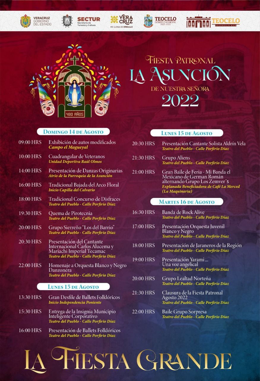 La Secretaría de Turismo y Cultura (SECTUR) y el ayuntamiento de Teocelo presentaron el cartel de actividades con motivo de la Fiesta de La Asunción de Nuestra Señora, en honor a la santa patrona de este municipio; el programa contempla más de 36 actividades que tendrán lugar del 5 al 16 de agosto.