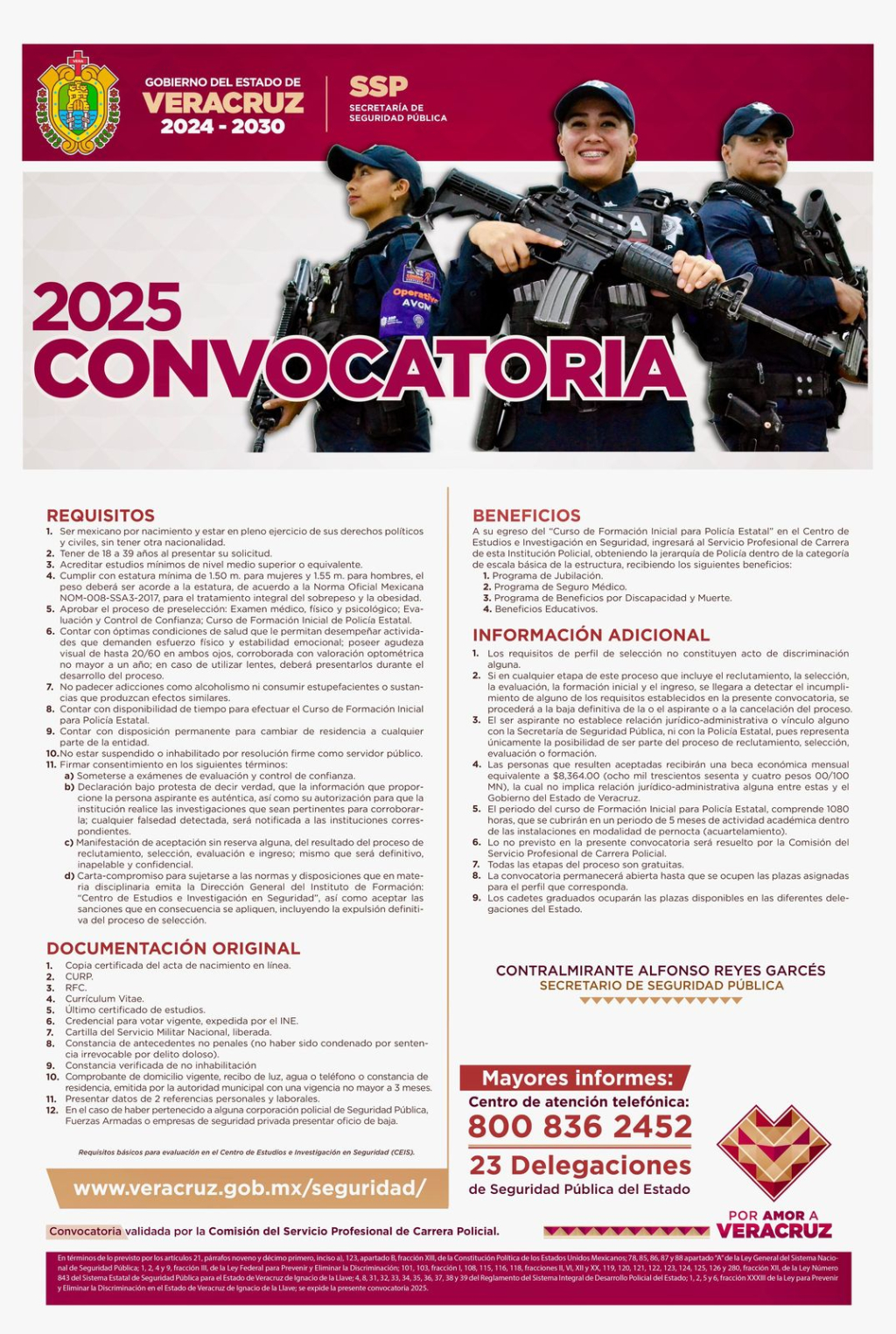 La Secretaría de Seguridad Pública convoca a mujeres y hombres con vocación de servicio a integrarse a la Policía Estatal, para servir con orgullo a la sociedad veracruzana. Si tienes entre 18 y 39 años, has concluido el nivel medio superior y cuentas con las condiciones físicas y de salud necesarias, esta es tu oportunidad de formar parte de una institución comprometida con la seguridad y el bienestar de la entidad. Requisitos Ser mexicano por nacimiento y no tener otra nacionalidad. Tener entre 18 y 39 años. Contar con estudios de nivel medio superior. Cumplir con la estatura mínima: 1.50 m para mujeres y 1.55 m para hombres. Aprobar los exámenes médico, físico, psicológico y de control de confianza. Gozar de buena salud física y emocional. No tener antecedentes penales ni estar inhabilitado como servidor público. Disponibilidad para cambio de residencia dentro del estado. Los beneficios al ingresar son la incorporación al Servicio Profesional de Carrera Policial, seguro médico y beneficios por discapacidad y muerte, programa de jubilación y prestaciones sociales, beca económica mensual de $8,364.00 durante el Curso de Formación Inicial, y oportunidades de crecimiento y capacitación continua. El Curso de Formación Inicial tiene una duración de cinco meses en modalidad de pernocta (acuartelamiento), con un total de 1,080 horas de capacitación. Al egresar, los cadetes se integrarán a las distintas delegaciones de la Policía Estatal en Veracruz. La documentación requerida es el acta de nacimiento, CURP y RFC, certificado de estudios, credencial de elector vigente, cartilla militar liberada (en caso de ser hombre), constancia de antecedentes no penales y comprobante de domicilio. Para mayores informes, comunícate al teléfono 800 836 2452, visita el sitio web www.veracruz.gob.mx/seguridad o acude a las Delegaciones de Seguridad Pública en el Estado.