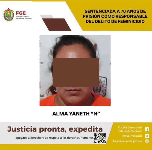 La Fiscalía General del Estado, a través de la Fiscalía Coordinadora Especializada en Delitos contra las Mujeres, Feminicidio, Familia y Trata de Personas, logró sentencia condenatoria de 70 años de prisión en contra de Alma Yaneth “N” como responsable del delito de feminicidio, cometido en agravio de la víctima identificada con las iniciales C.A.C.