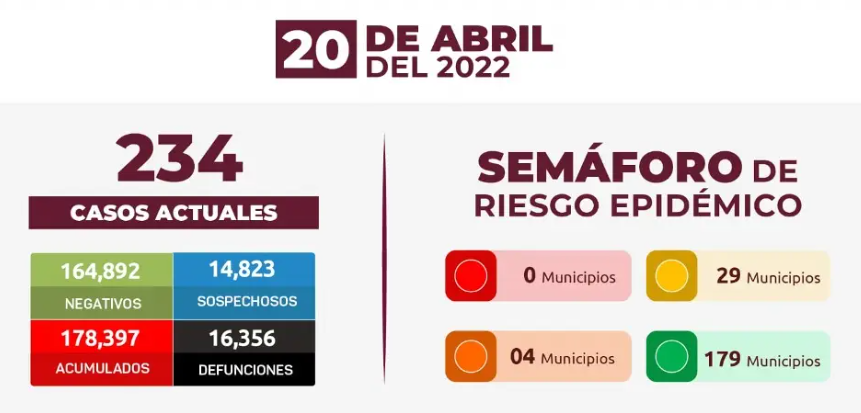 Con respecto a los decesos, éstos ascienden a 16 mil 356 (+ 4 nuevos); contabilizando 164 mil 892 resultados negativos y 14 mil 823 sospechosos acumulados.