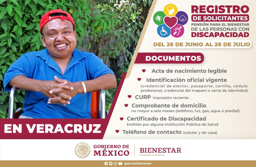 Cobertura universal es posible gracias a la voluntad y colaboración entre gobiernos federal y estatal, informa la secretaria de Bienestar, Ariadna Montiel 223 Módulos de Bienestar brindan atención de lunes a sábado de 10 de la mañana a 4 de la tarde La secretaria de Bienestar, Ariadna Montiel Reyes, informó que del 26 de junio al 26 de julio inicia el registro universal a la Pensión para el Bienestar de las Personas con Discapacidad en Veracruz, lo cual es posible gracias a la suma de esfuerzos entre el presidente de la República, Andrés Manuel López Obrador, y el gobernador de Veracruz, Cuitláhuac García Jiménez. El convenio entre ambos órdenes de gobierno establece la aportación de 50 por ciento de los recursos por parte del gobierno de Veracruz, y el otro 50 por ciento del gobierno federal, con el fin de que la pensión incluya a población con discapacidad de 30 a 64 años. La pensión atiende actualmente a un millón 273 mil 423 personas con discapacidad en el país, y es posible gracias a la política de austeridad y combate a la corrupción que aplica el gobierno federal en beneficio de la población con mayor vulnerabilidad. Ariadna Montiel recordó que la Pensión para el Bienestar de las Personas con Discapacidad ya es un derecho constitucional, prioritariamente para niñas, niños y jóvenes, y se entrega de manera directa y sin intermediarios. La pensión actualmente es de dos mil 950 pesos bimestrales. En Veracruz están a disposición 223 Módulos de Bienestar para registro de personas con discapacidad que brindan atención de lunes a sábado de 10 de la mañana a 4 de la tarde. Para conocer la Pensión para el Bienestar de las Personas con Discapacidad y el módulo más cercano a tu localidad, consulta la página oficial de la Secretaría de Bienestar: gob.mx/bienestar Los documentos que deberán presentarse son: ● Identificación oficial vigente ● CURP de reciente impresión ● Acta de nacimiento legible ● Comprobante de domicilio no mayor a seis meses ● Certificado de Discapacidad emitido por alguna institución pública de salud ● Número de teléfono celular para dar seguimiento al trámite En caso de que la persona con discapacidad no pueda trasladarse al Módulo de Bienestar, por causa de fuerza mayor que le impida salir de su domicilio, un familiar o auxiliar podrá llevar la documentación requerida para iniciar el trámite y solicitar visita domiciliaria para que se realice el registro directamente en su hogar. Asimismo, está disponible la Línea de Bienestar 800 639 42 64. Esta pensión está dirigida a personas con discapacidad permanente, por lo que la incorporación está sujeta al cumplimiento de todos los requisitos.