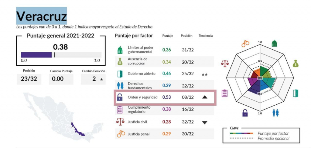 La mejoría en este renglón ha sido constante de 2018 a la fecha, pues Veracruz pasó de una calificación de 0.47 en ese año, a 0.53 en 2021-2022, en una escala donde 1 significa una máxima adhesión o cumplimiento de un estado de derecho.