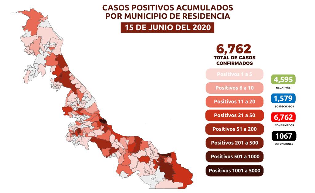La cifra de positivos acumulados es de 6 mil 762 en 155 demarcaciones; 3 mil 827 recuperados, mil 868 en vigilancia y 865 activos: Veracruz 2430, Coatzacoalcos 699, Poza Rica 478, Minatitlán 297, Boca del Río 271, Córdoba 225, Tuxpan 176, Xalapa 169, Cosoleacaque 110, Orizaba 107, Medellín 103, Papantla 100, Cosamaloapan 87, San Andrés Tuxtla 82, Fortín 67, Coatzintla 64, Martínez de la Torre 58, Nanchital y Tierra Blanca 52, Tihuatlán 47, Alvarado 46, La Antigua y Las Choapas 44, Perote 40, Agua Dulce 38, Jáltipan 36, Acayucan 32, Río Blanco y Santiago Tuxtla 30.