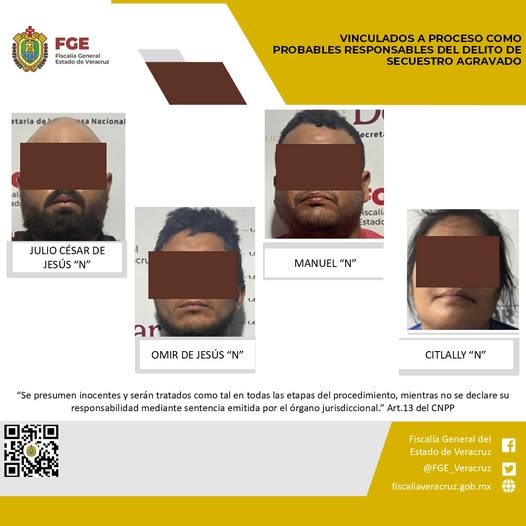 La Unidad Especializada en Combate al Secuestro y la Extorsión obtuvo vinculación a proceso en contra de Manuel “N”, Julio César de Jesús “N”, Omir de Jesús “N” y Citlally “N” como probables responsables del delito de secuestro agravado, cometido en agravio de la víctima identificada con las iniciales D.R.P.